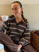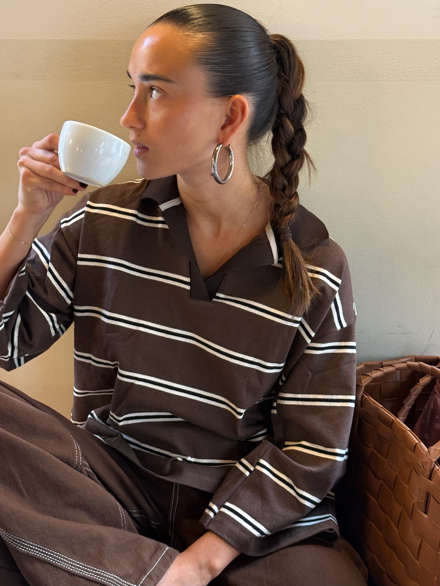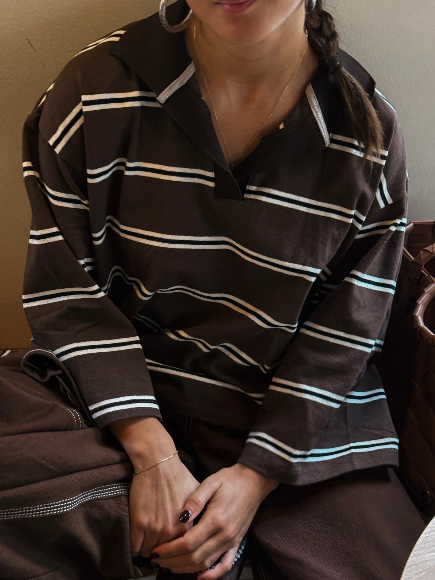 Een heerlijke zachte polosweater in een warme chocoladebruine tint, met een sportieve V-hals en klassiek streeppatroon.