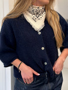 Het vestje heeft een subtiel ribpatroontje, een klassieke ronde hals en verfijnde knoopjes aan de voorkant. De driekwart mouwen geven ‘m een elegante, vrouwelijke uitstraling en maken het de perfecte cardigan voor zonnige lentedagen en frisse ochtenden, terwijl hij ook heerlijk comfortabel is tijdens koudere winterdagen.