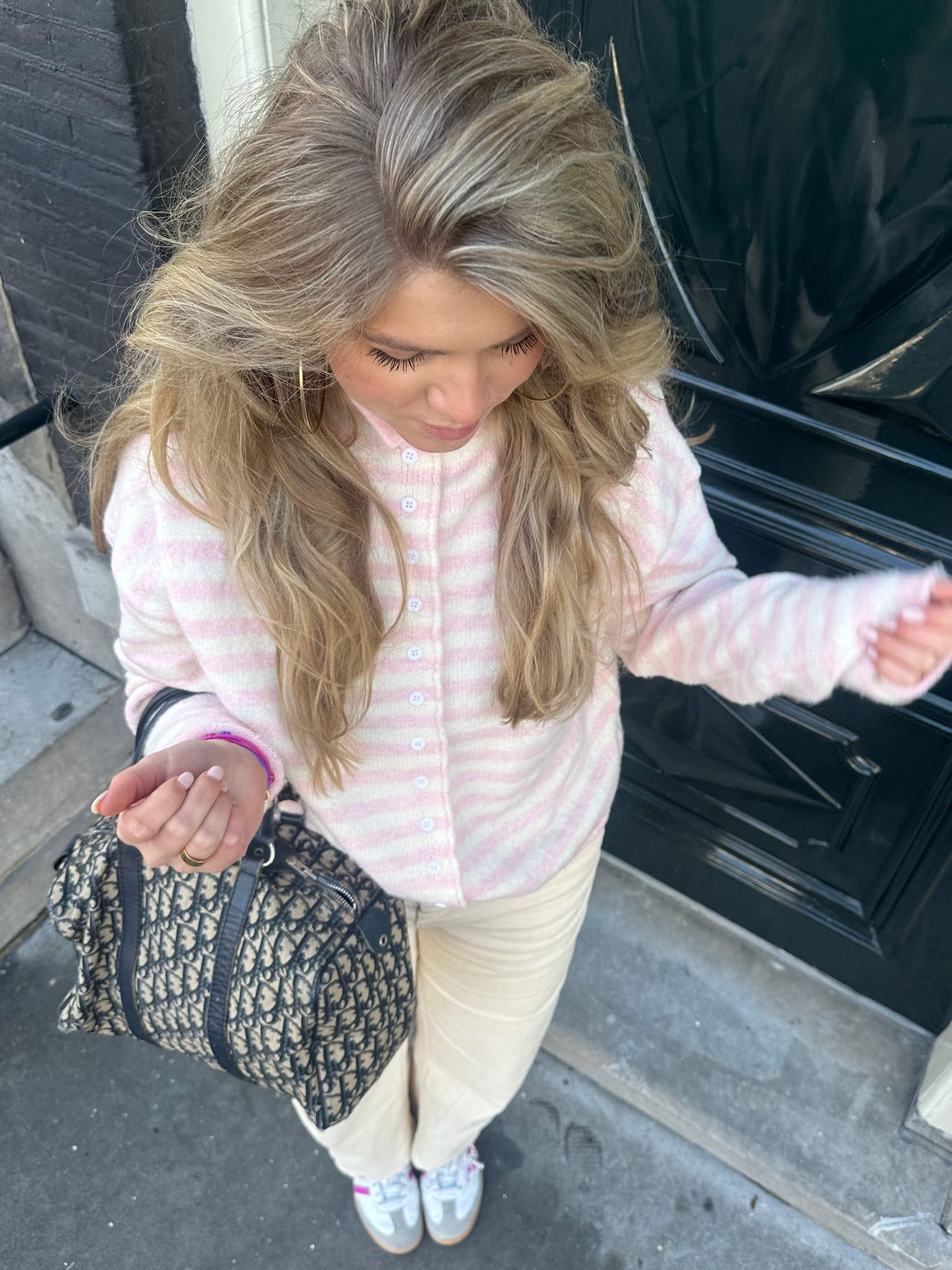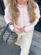 Hoe enig is de nieuwe gestreepte cardigan in het lichtroxe met wit! Draag de knoopjes los aan de onderkant voor een leuke touch!