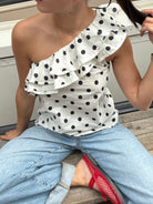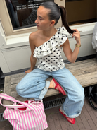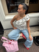 De Suus top is een echte musthave voor deze zomer. De one-shoulder top met ruffles en polkadots zorgen voor een trendy & stijlvolle look. De kleur van de top is gebroken wit.