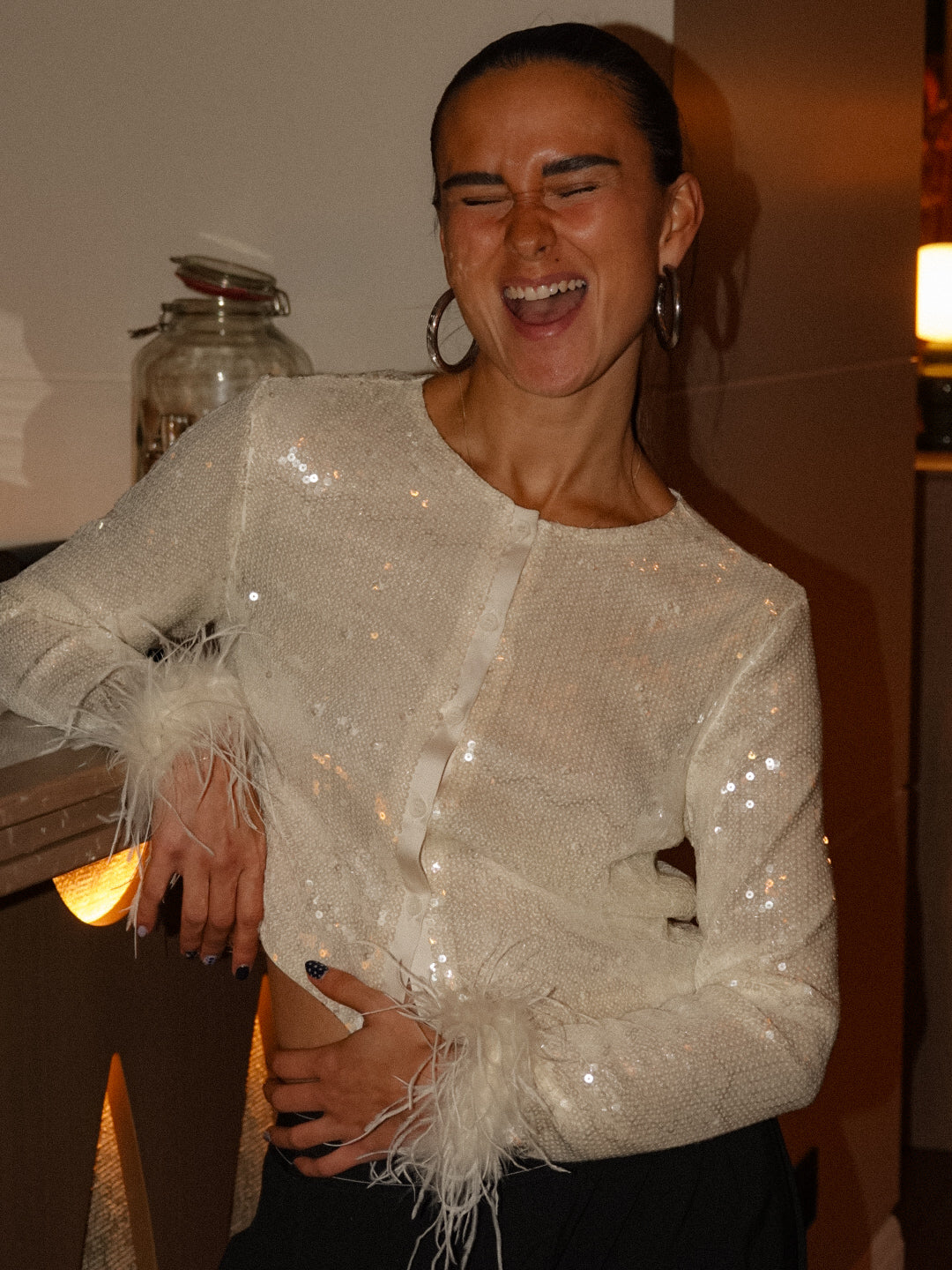 De Elle Glitter Top Feather in ecru is een ultieme statement top voor feestelijke gelegenheden. De top is volledig bedekt met all-over sequin glitters die zorgen voor een luxe, sprankelende uitstraling.