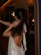 De jurk heeft een ronde hals die je kunt strikken met een lang, sierlijk lint, wat zorgt voor een vrouwelijke en verfijnde touch. De echte eyecatcher is de volledig open rug, die laag doorloopt en de jurk een sensuele, elegante uitstraling geeft.