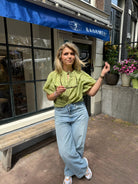 De blouse heeft een wijd model aan de onderkant waardoor je hem zelf kunt knopen of instoppen aan de voorkant van je jeans.