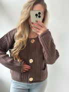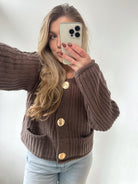 De chunky cardigan in een prachtige chocolade bruine kleur heeft mooie gouden knopen, wat het een luxe en modieuze uitstraling geeft.