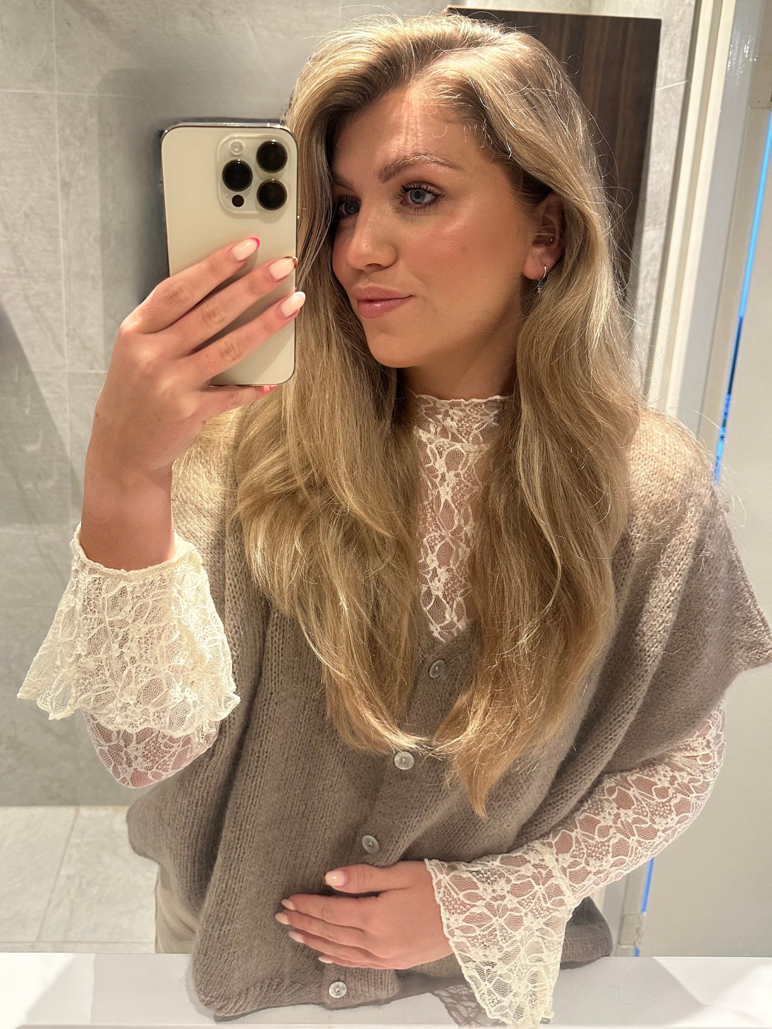 De kanten top die onder het gilet wordt gedragen, shop je hier