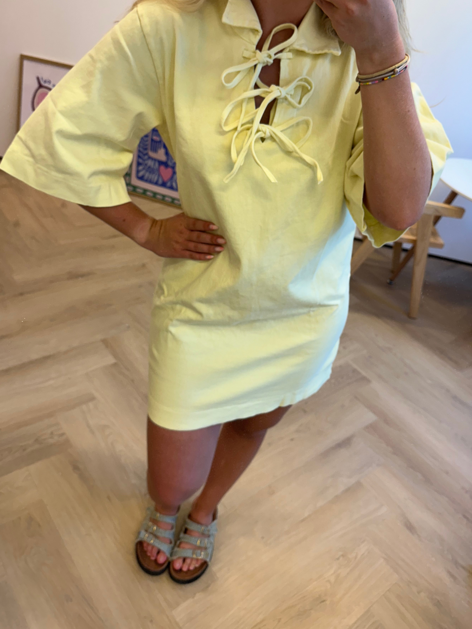 Deze prachtige denim jurk met strikjes style je gemakkelijk met je favoriete ballerina’s of sandalen voor een vrolijke easy- to-wear look.