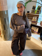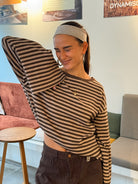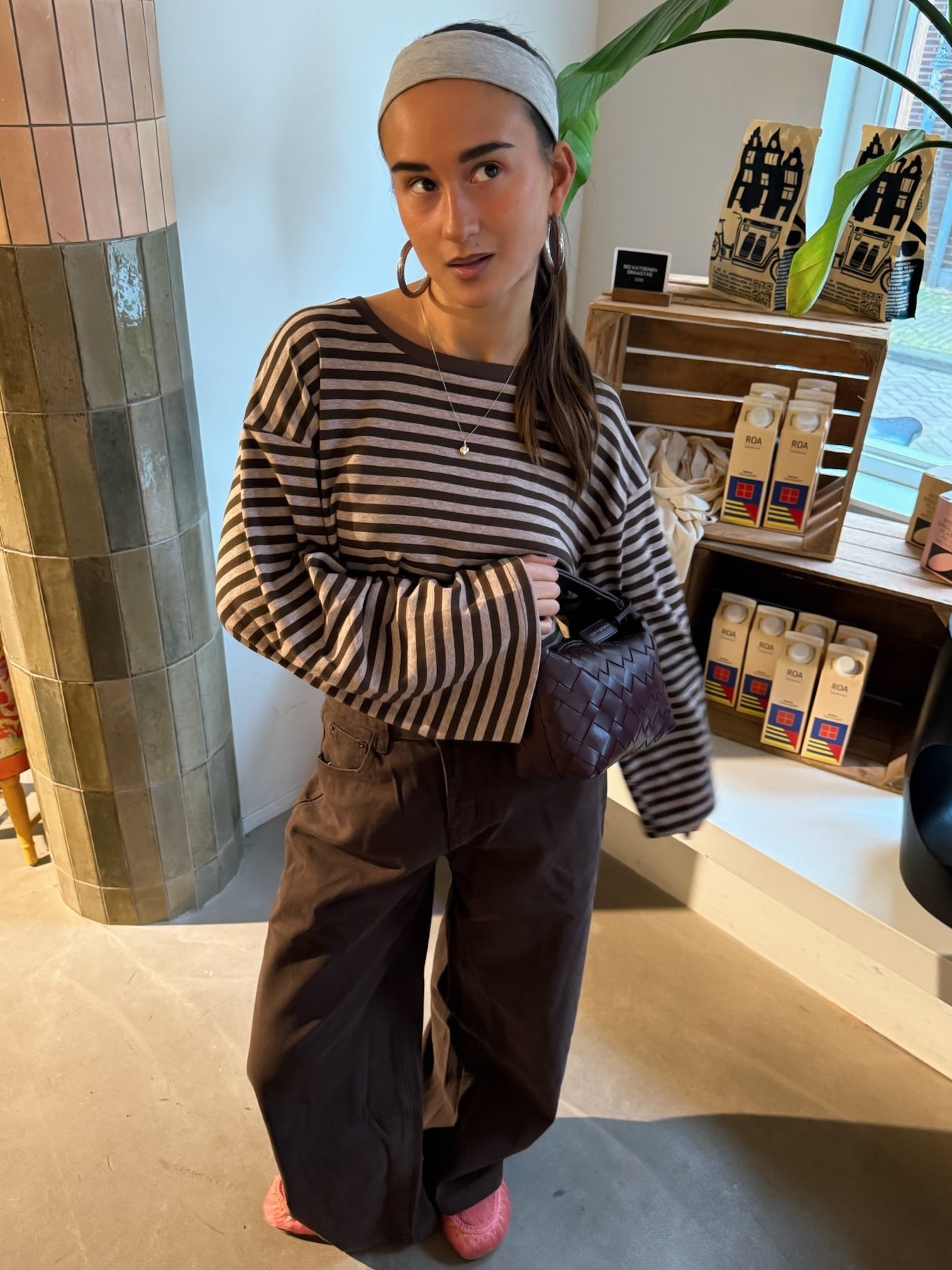 Deze oversized longsleeve heeft een rijke chocoladebruine kleur met lichterbruine streepjes. De relaxte fit geeft een effortless look en zit heerlijk comfortabel.