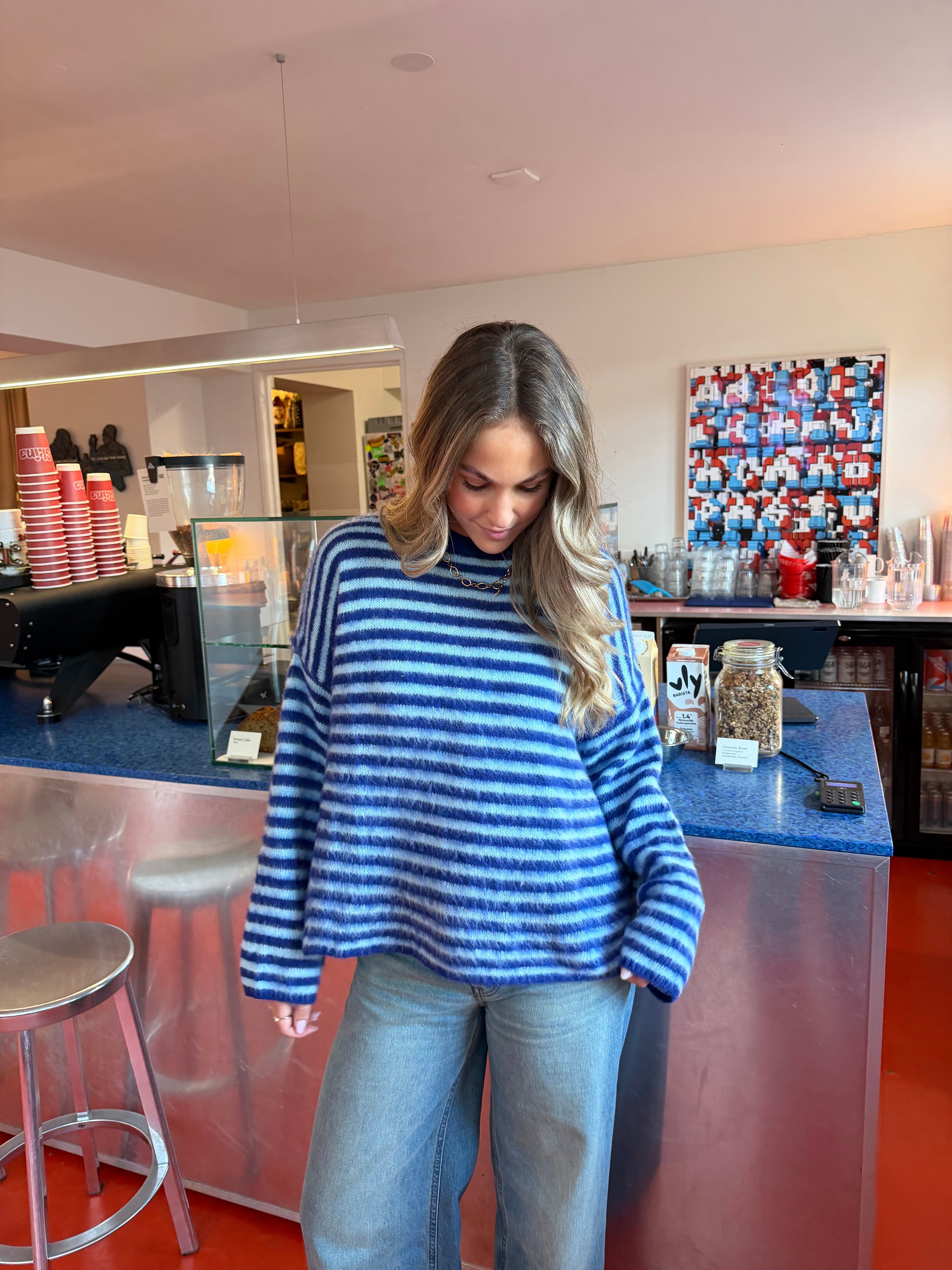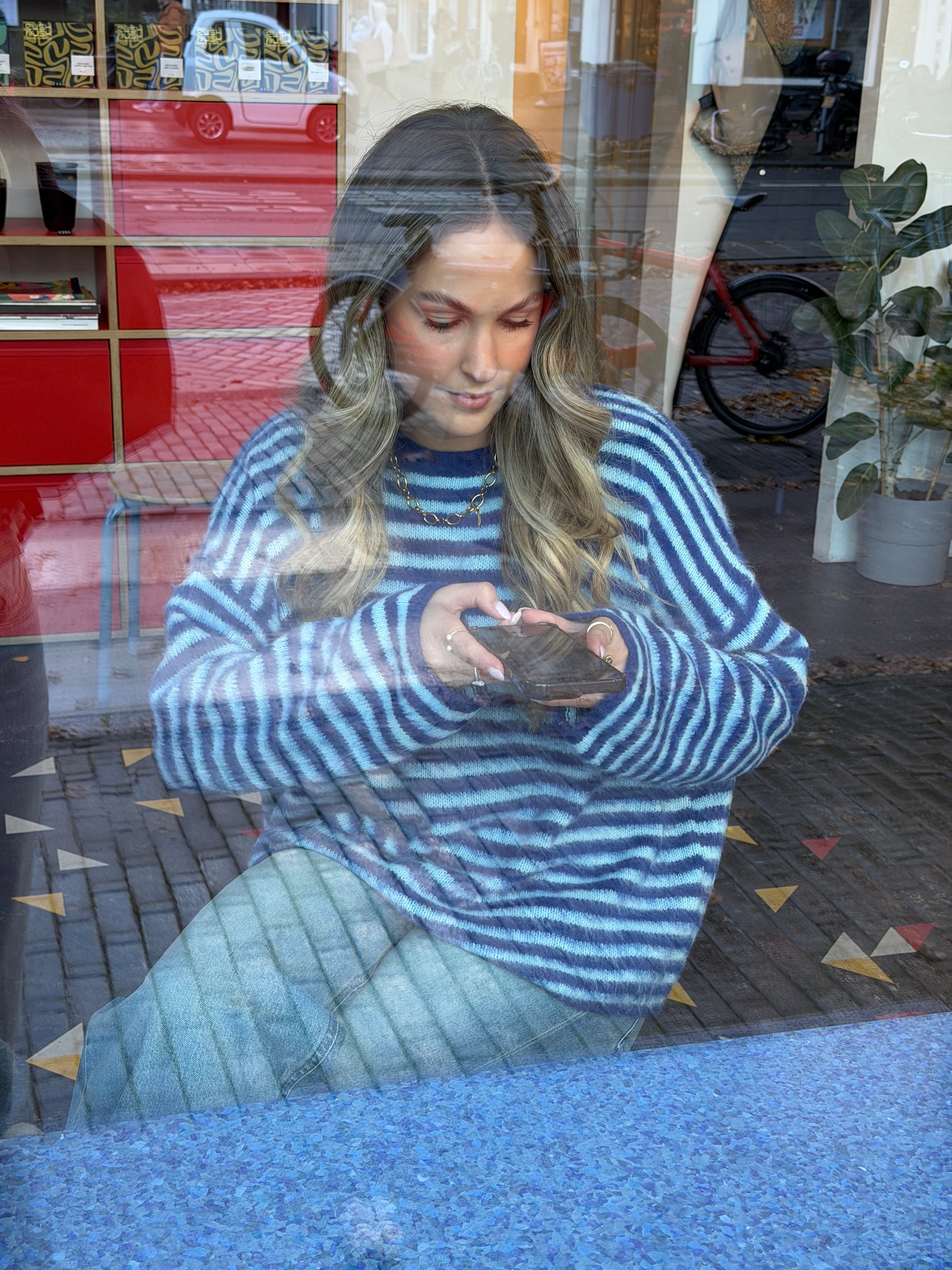 De Mikky Knit is een warme trui met een speels streeppatroon in lichtblauw en blauw. De opvallende kleurencombinatie geeft de knit een frisse, moderne look. Comfy & Cozy voor de koudere dagen.