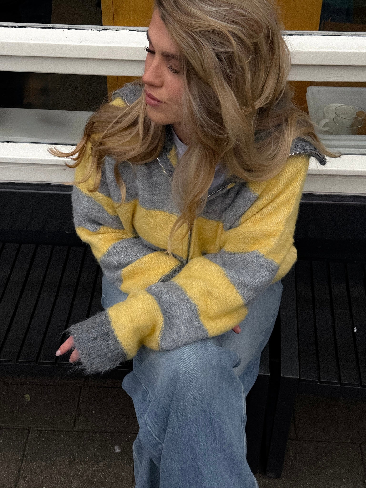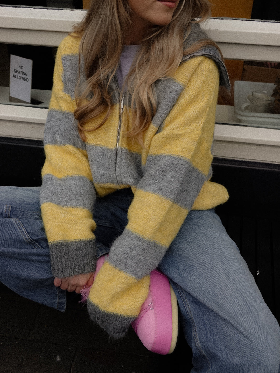 Dit gestreepte vest valt meteen op door de frisse combinatie van geel en grijs. De relaxed fit geeft ’m die effortless look, terwijl de brede kraag en ritssluiting zorgen voor een subtiel sportieve twist. Een cozy knit die je outfit net even extra karakter geeft.