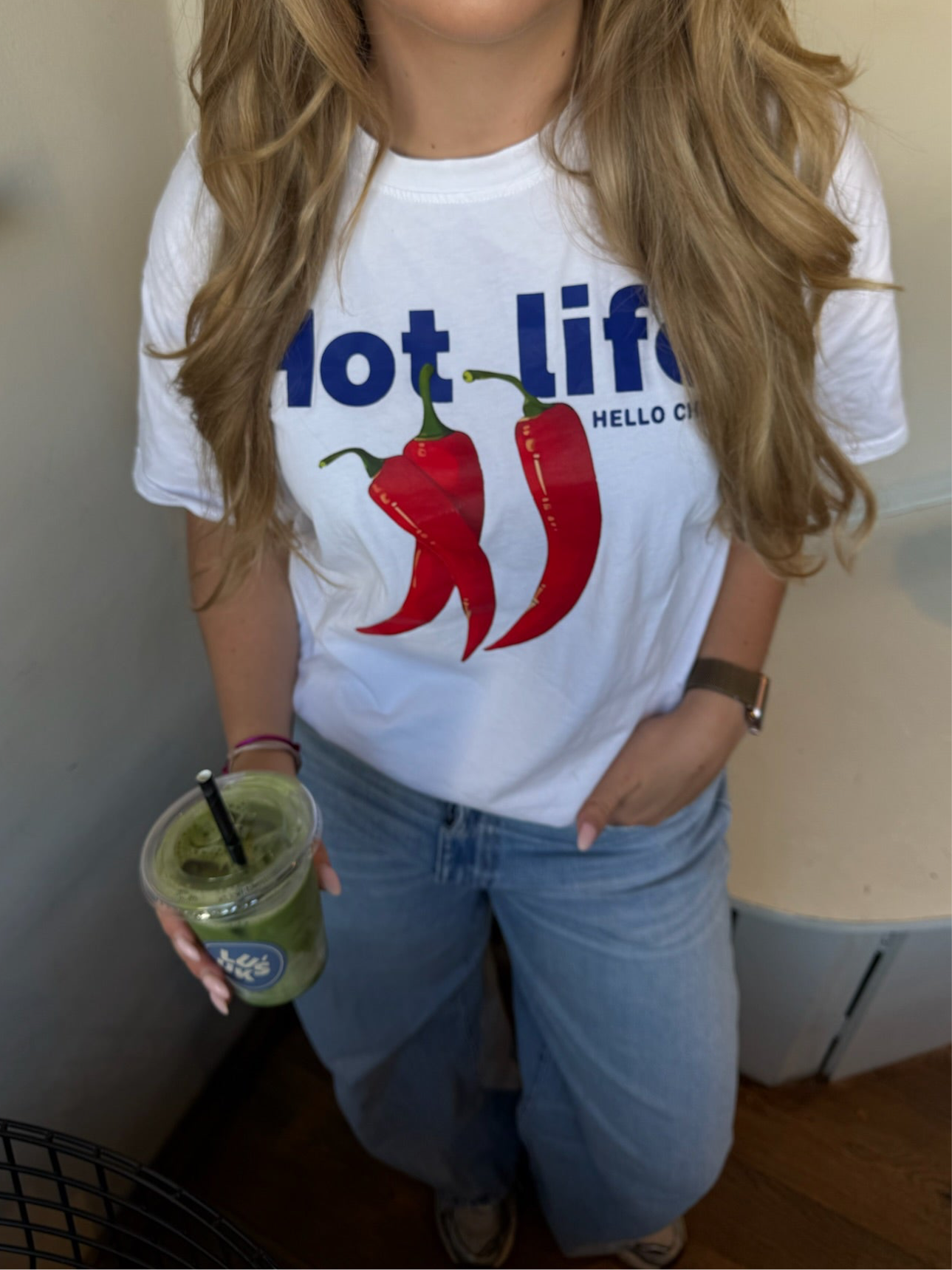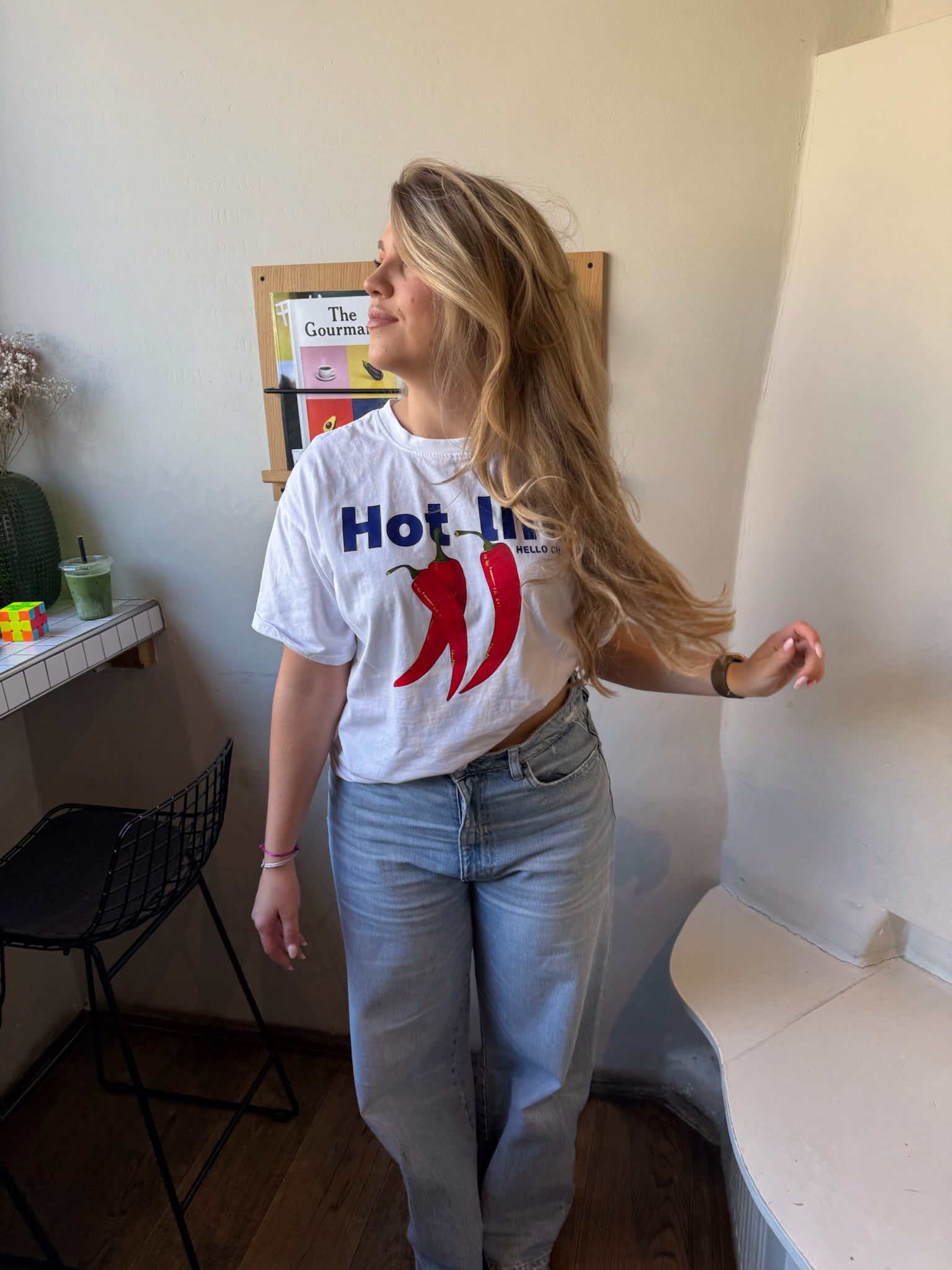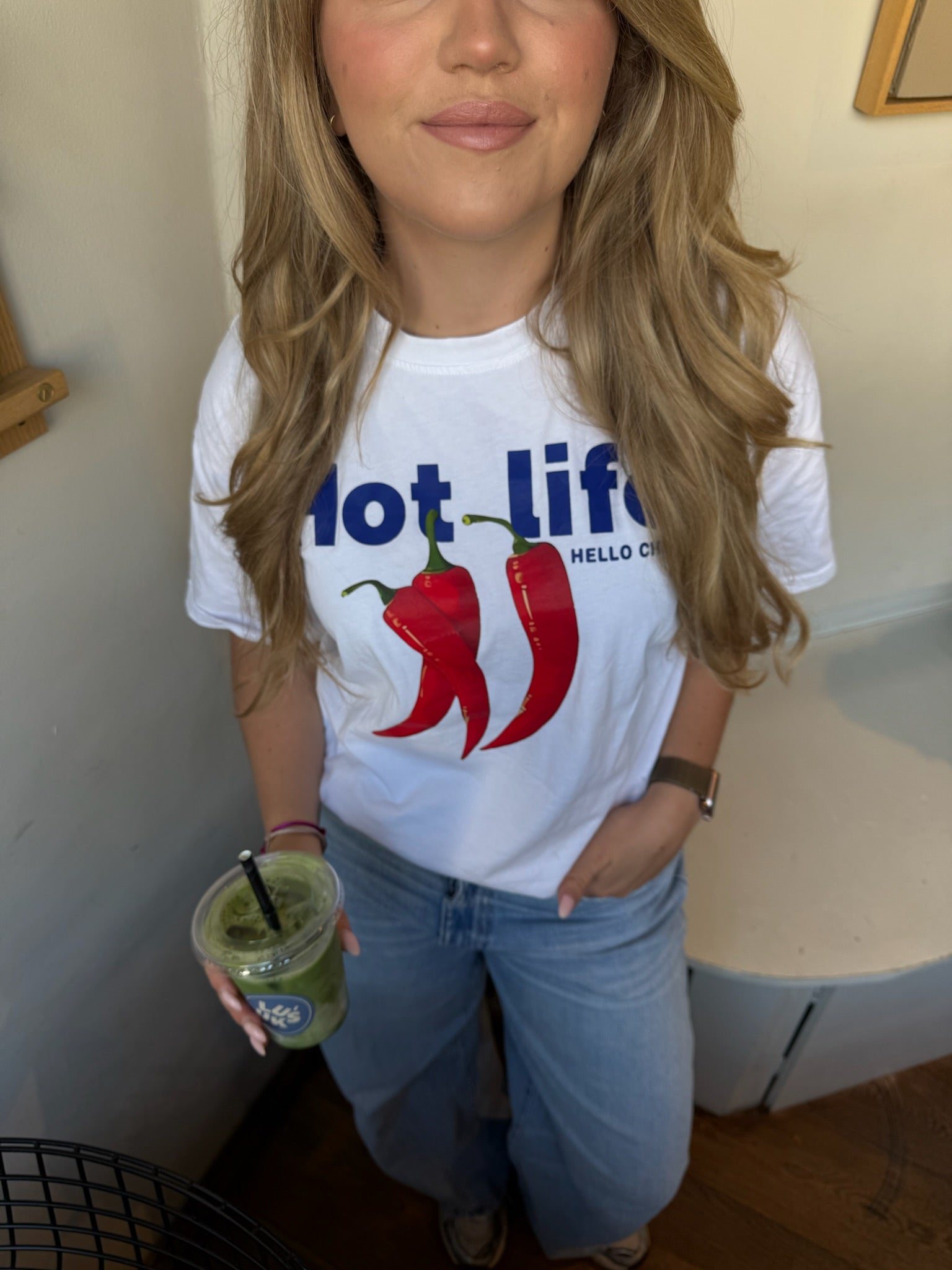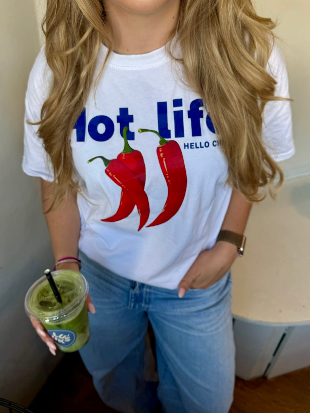 Het Blair tshirt met de tekst "hot life" style je met je favoriete witte broek, denim of grijze jeans! We are in love!