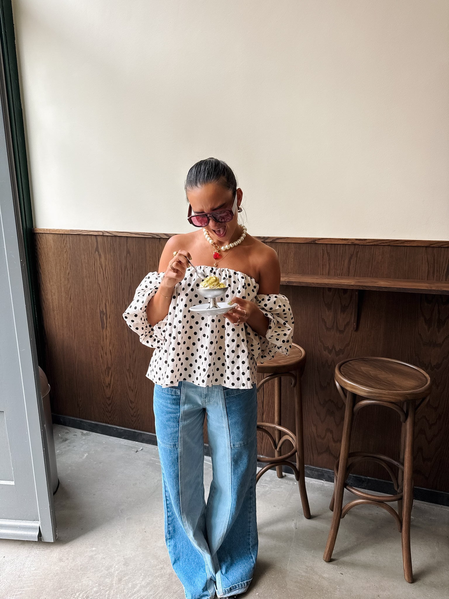 Hoe gaaf is deze offshoulder top in deze nieuwe polkadot print! Een echte eyecatcher! Gemaakt in Italië.