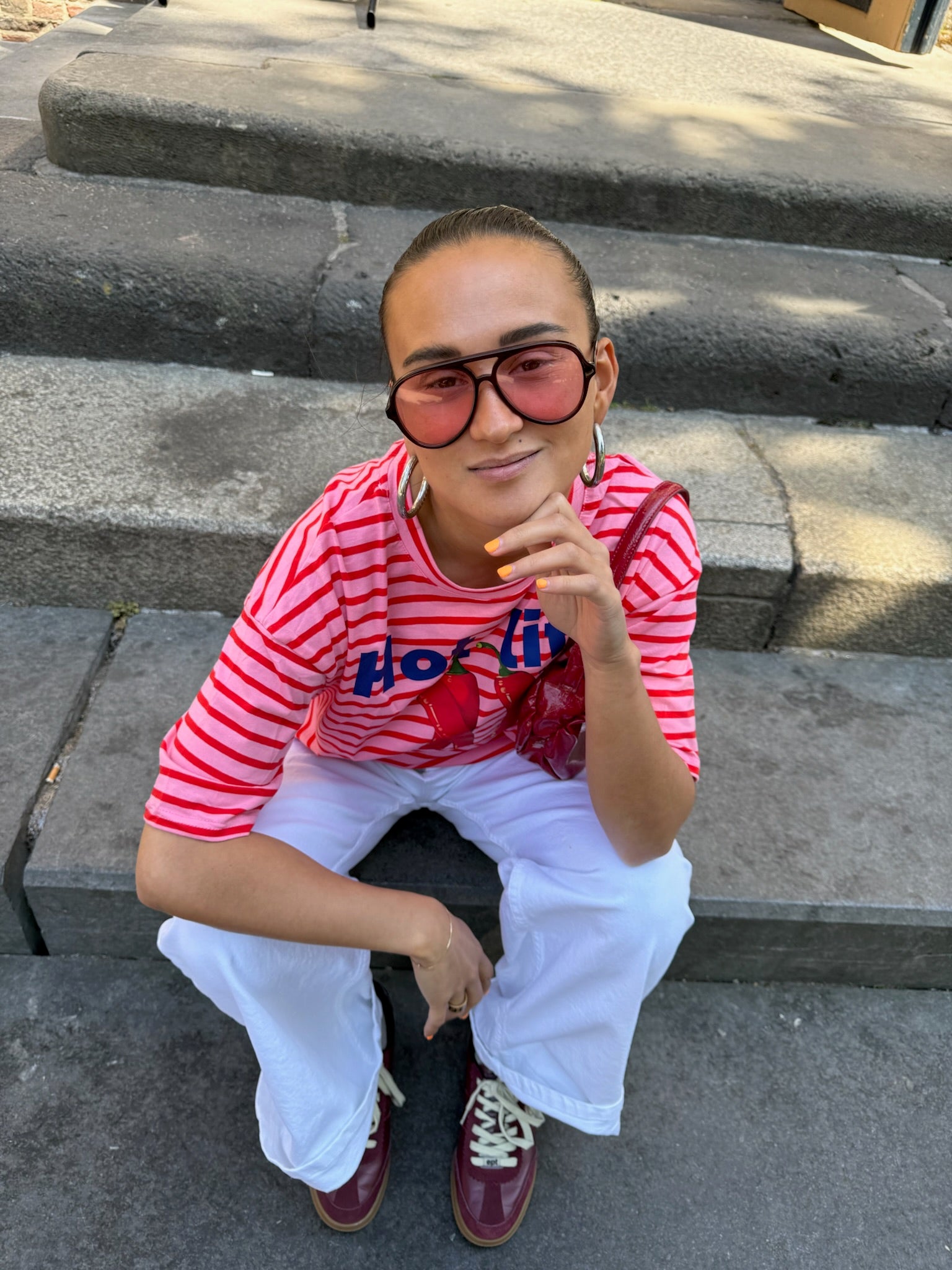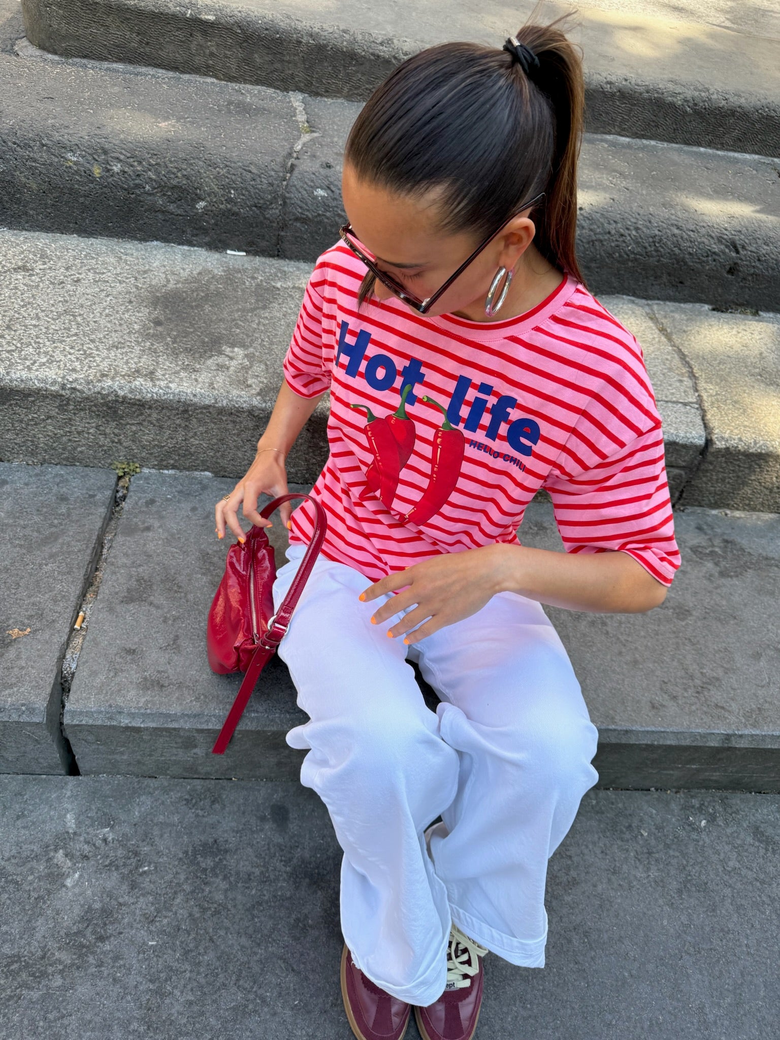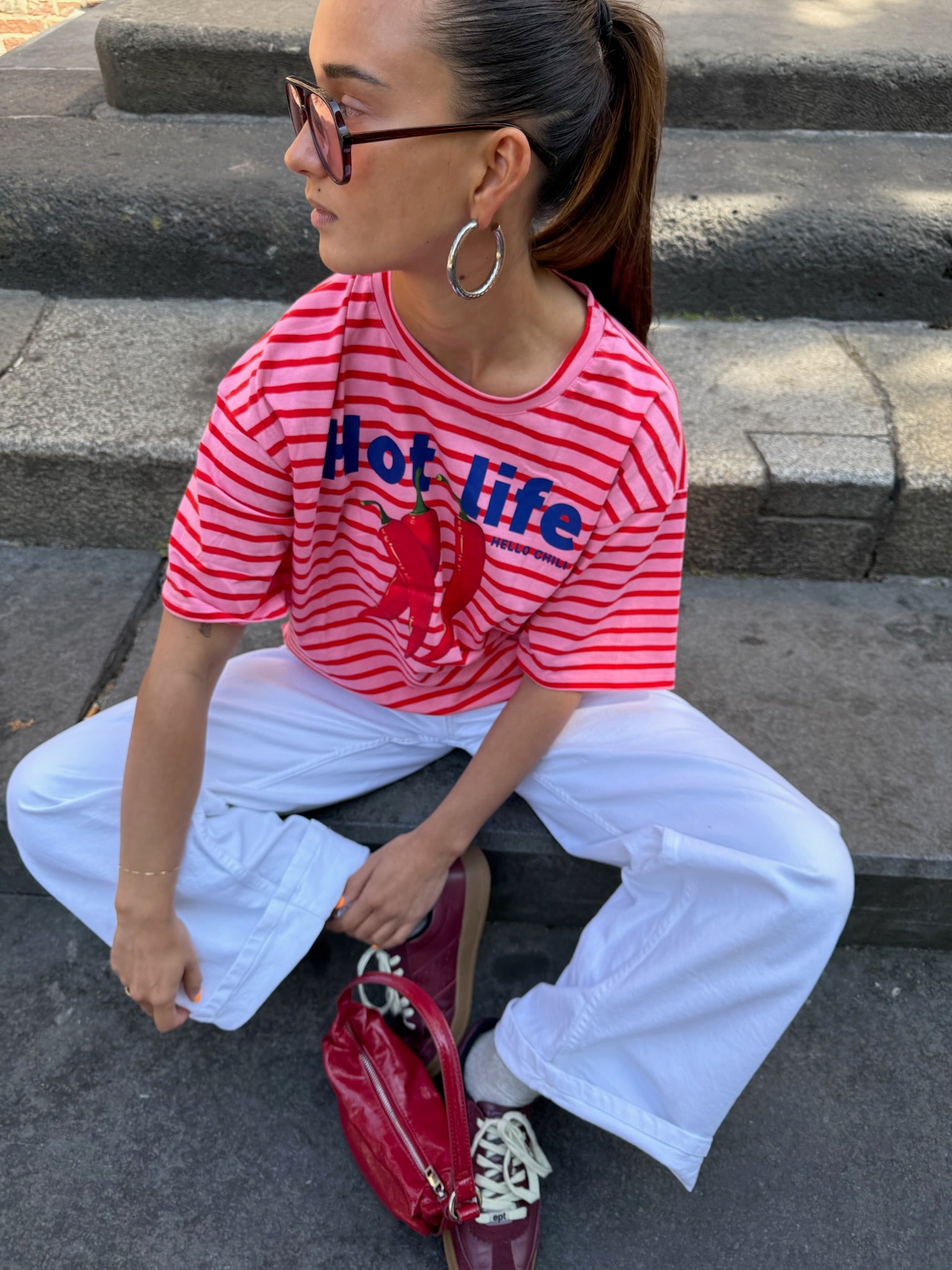 Het gestreepte Blair tshirt met de tekst "hot life" style je met je favoriete witte broek, denim of grijze jeans! We are in love!