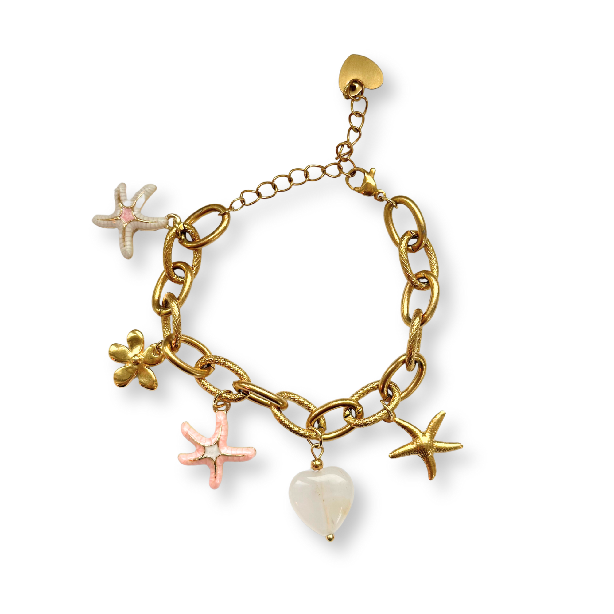 De Coco bracelet heeft verschillende prachtige bedels gecombineerd met een mooie gouden chain. De chain en de sluiting zijn gemaakt van roestvrijstaal.