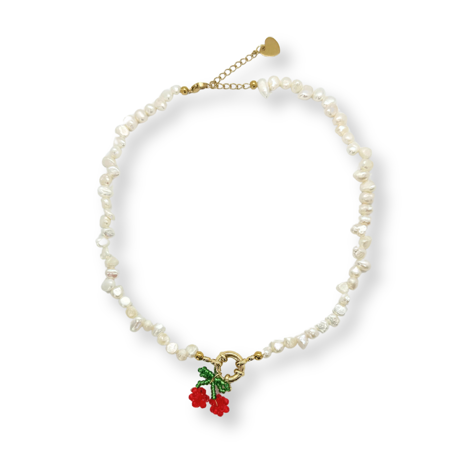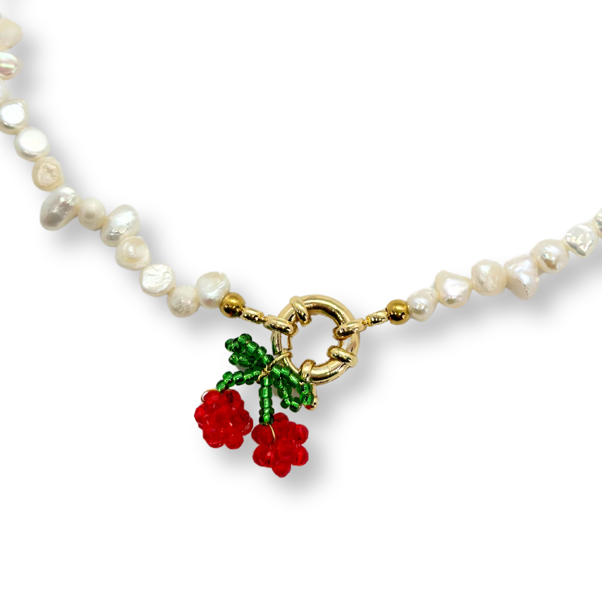 De cherry me up necklace is een echte statement piece. De chique parels in combinatie met de gouden details en de prachtige handgemaakte kers vormen de perfecte eyecatcher. Time to cherry up your outfit!