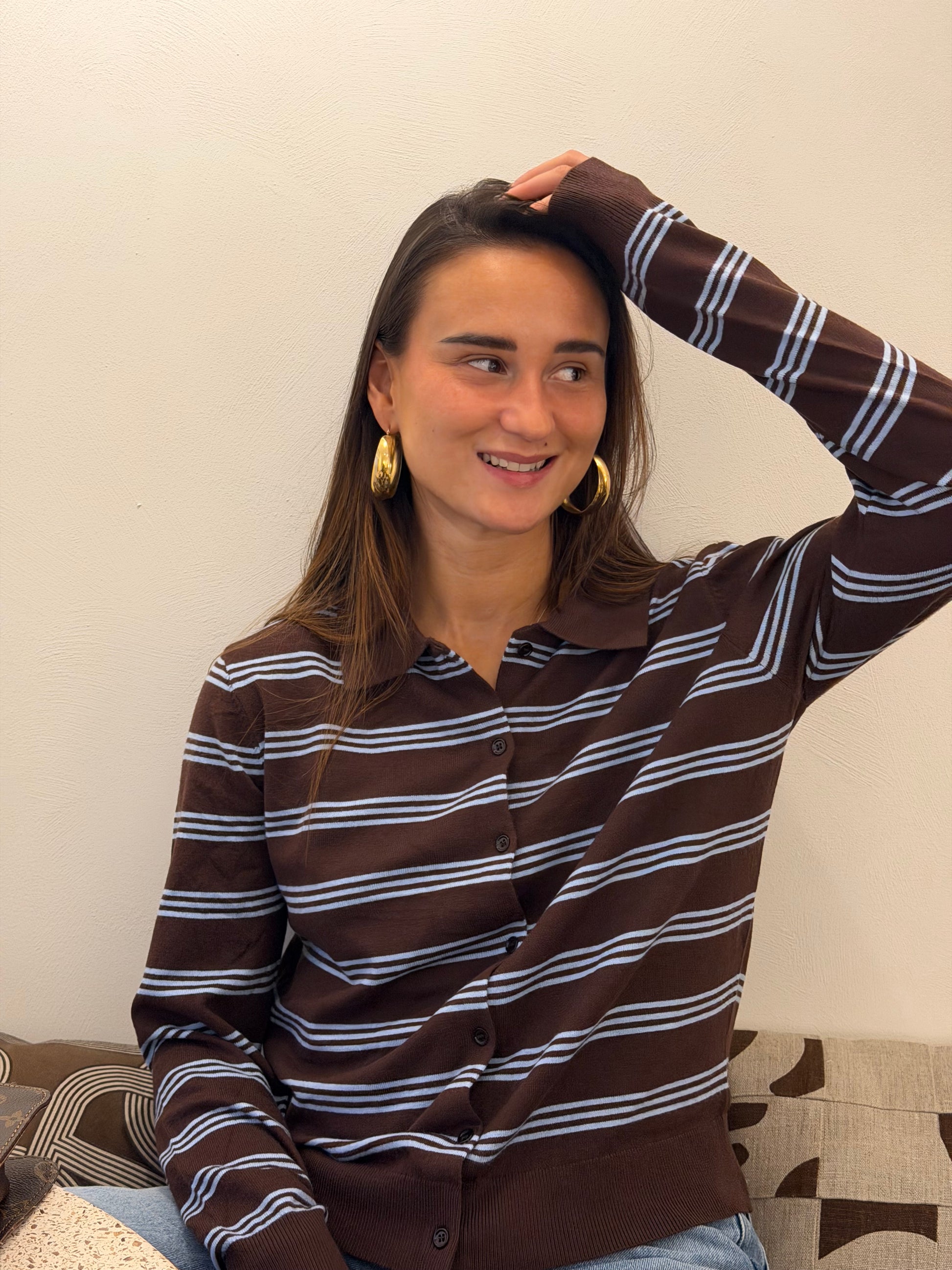 Stijlvol bruine polotrui met fijne blauwe streepjes. De zachte knit en klassieke polo-hals met knoopjes maken het een ideaal item voor de herfst. Comfortabel, tijdloos en makkelijk te combineren.